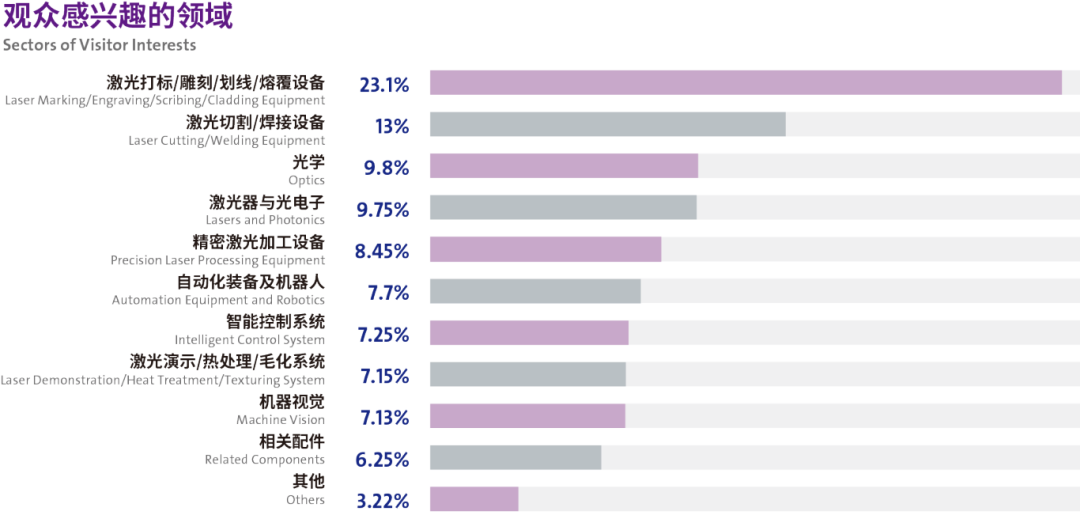 由往年观众数据分析可以看到,来自自动化、机床 、3C电子、汽摩制造、计算机、半导体等行业观众占比相对较大;而在展品方面,观众感兴趣的板块主要集中在激光打标/雕刻/划线/熔覆设备、激光切割/ 焊接设备、光学、激光器与光电子等领域。专业观众精准配对,塑造汉诺威深圳激光展超专业的品牌形象!