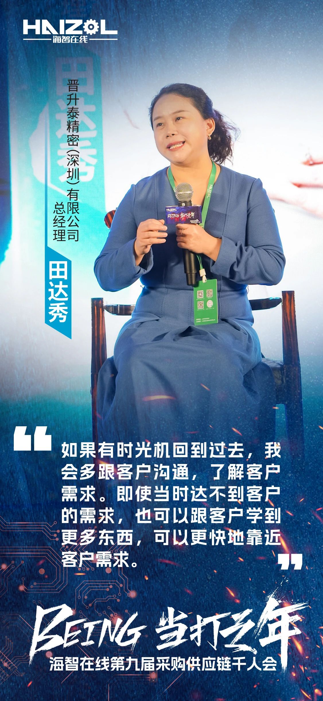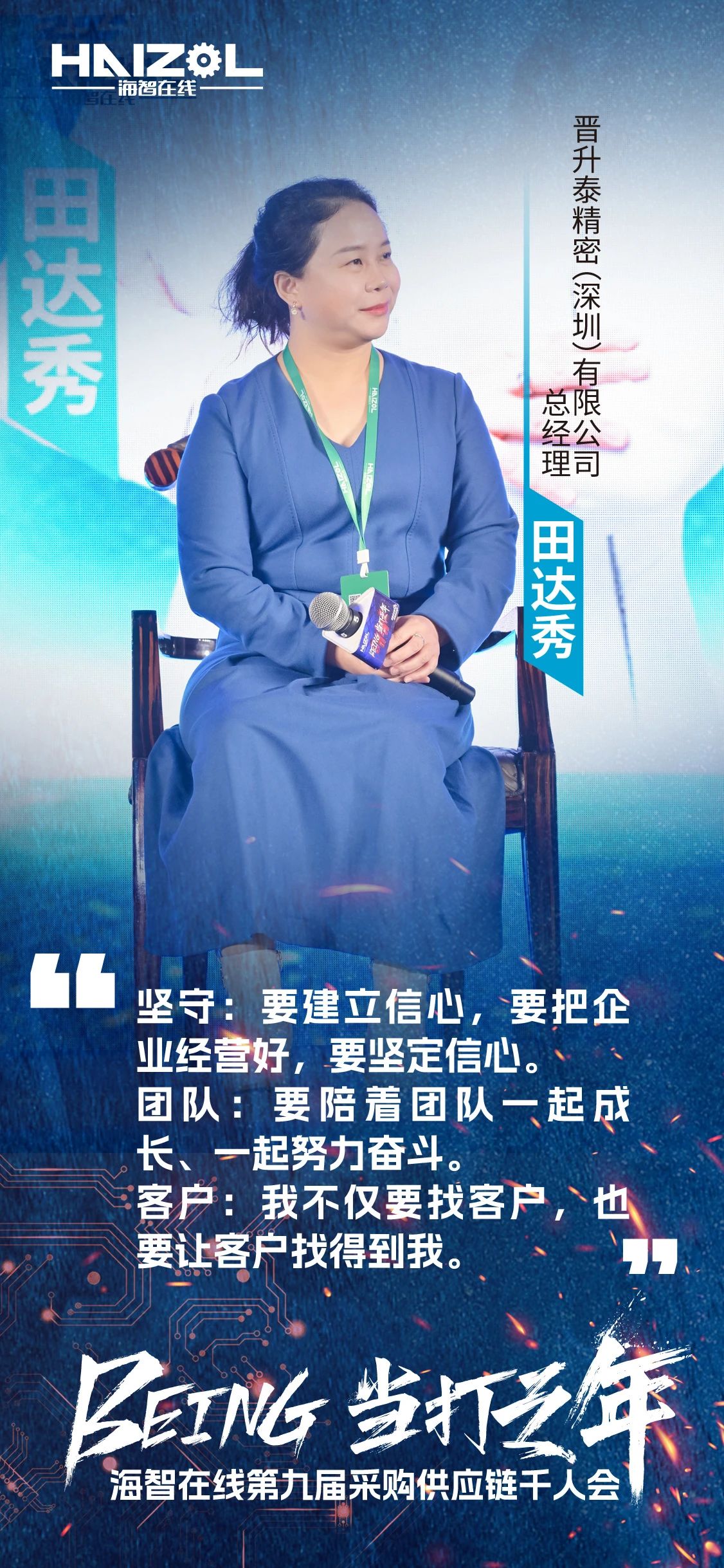 晋升泰精密(深圳)有限公司总经理田达秀提到:十年前一次审厂的失败,让我开始思考如何更多、更深入地与客户沟通,了解他们的需求。现在,我对于未来的发展有三个关键词:坚守——要建立信心、坚定信心,要把企业经营好;团队——坚持团队的共学、技能培训、总结沟通,一起成长与奋斗;客户——不仅要找客户,也要用各种数字化的方式,让客户找得到我。