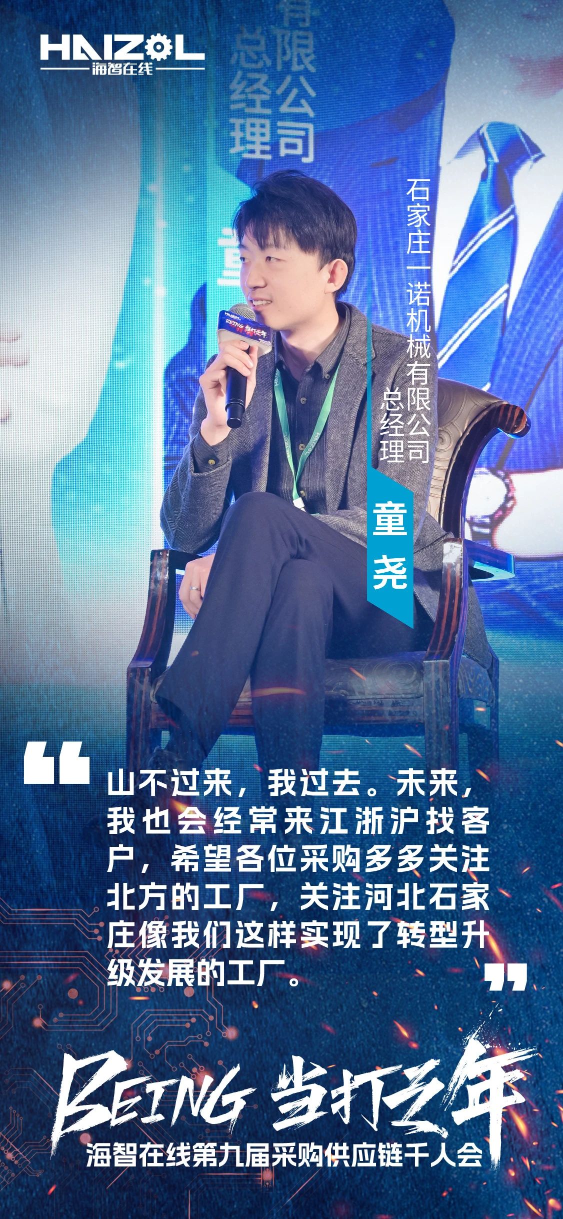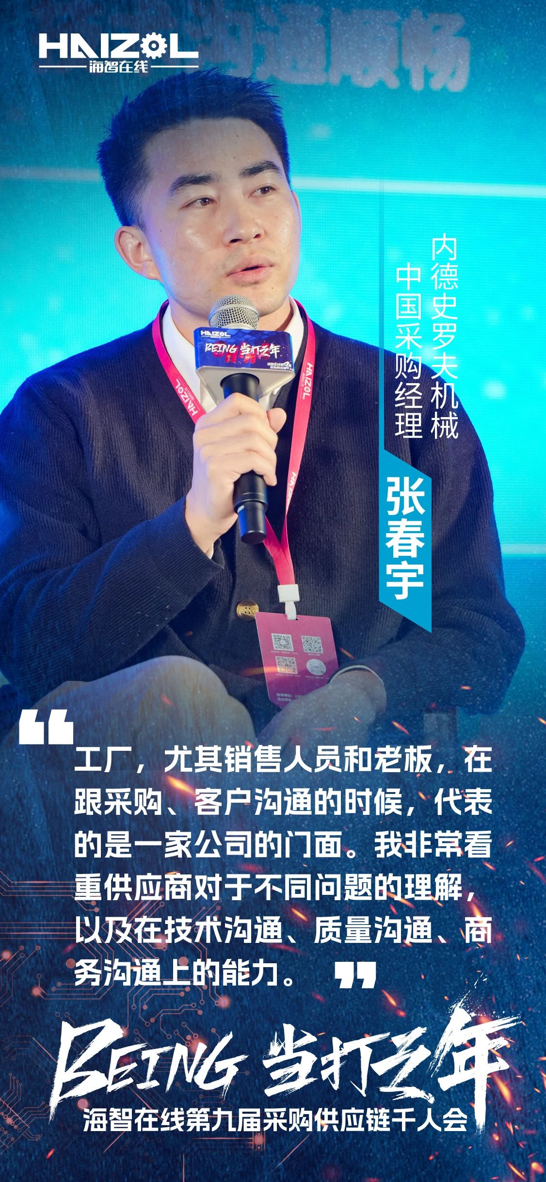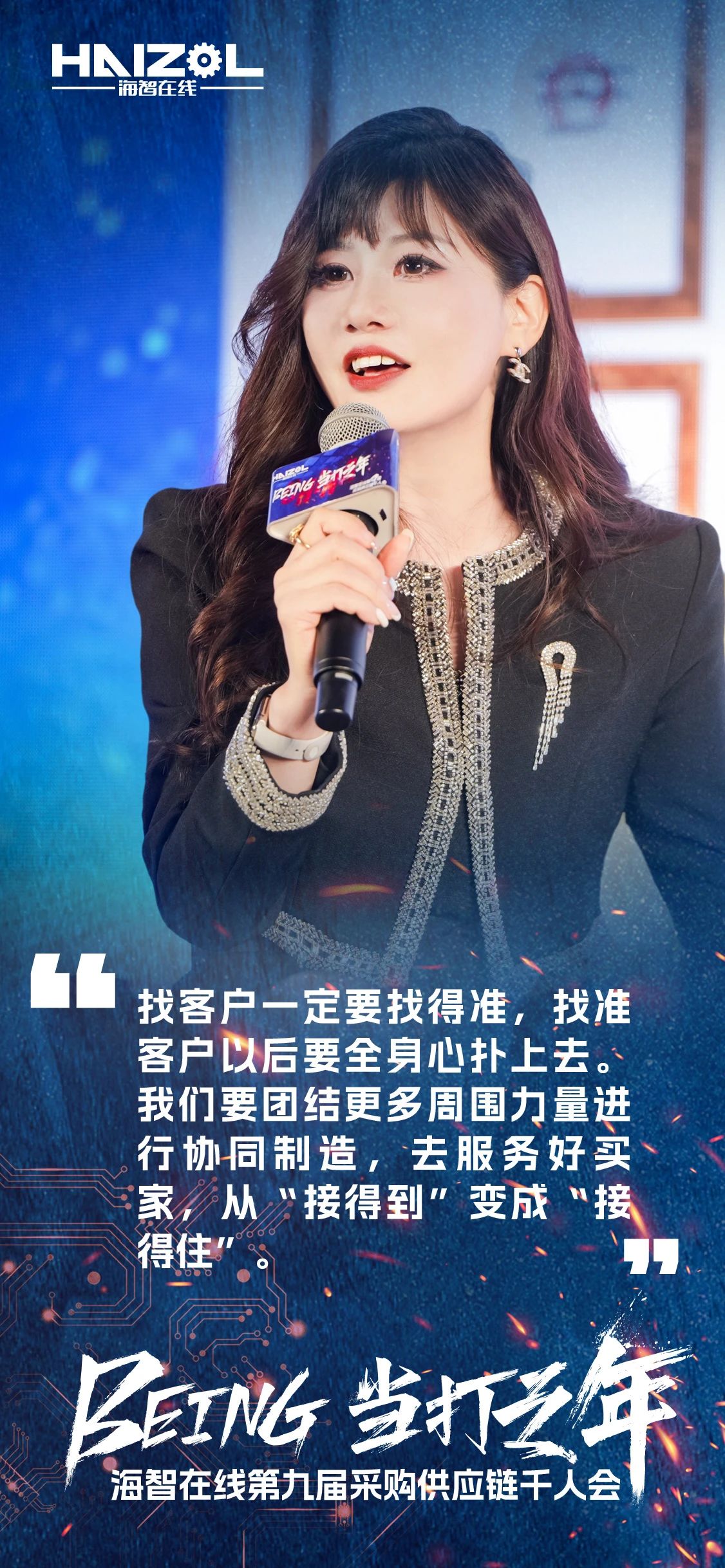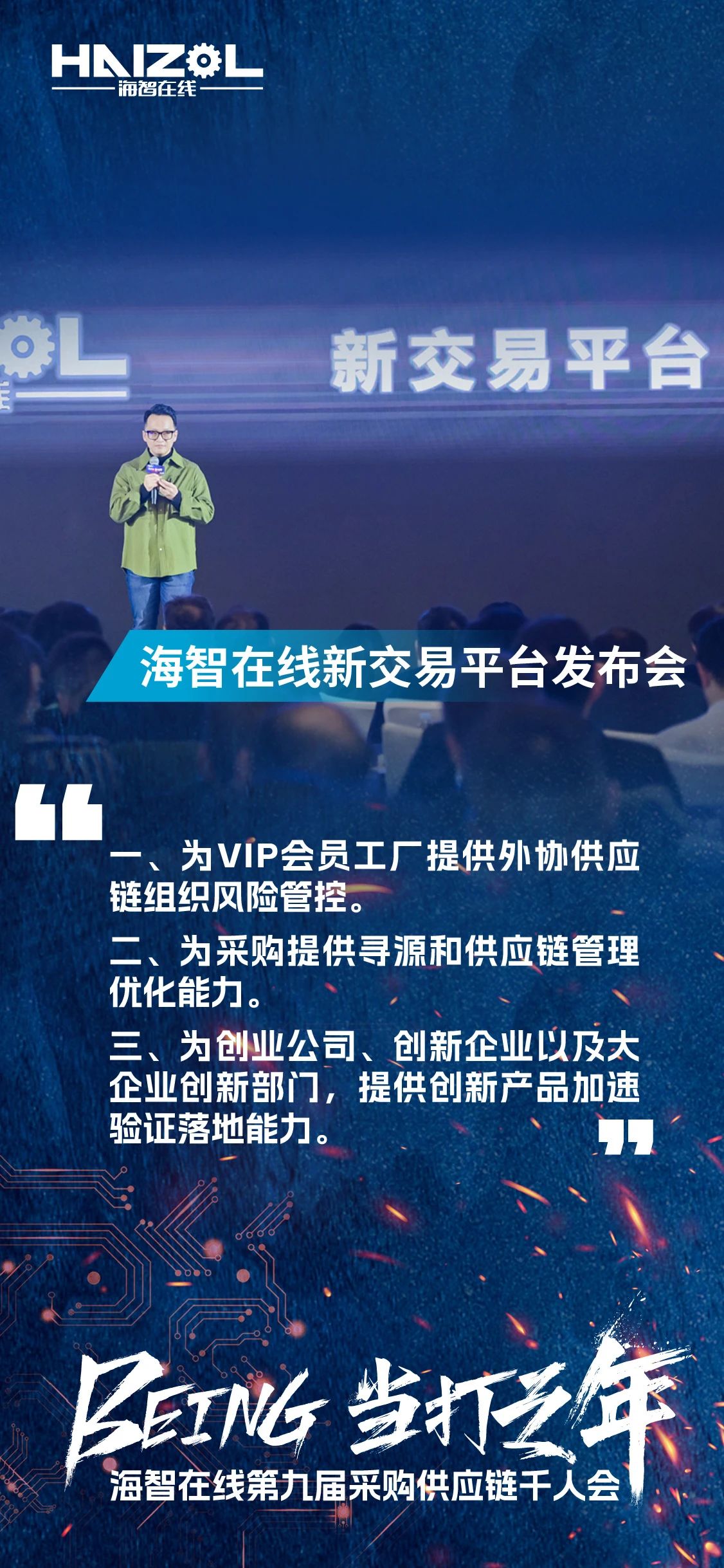 2024年12月14日,由上海市商务委员会指导,上海市徐汇区政府支持的海智在线第九届采购供应链千人会,在上海闵行星河湾大酒店成功举办。本次大会以“Being·当打之年”为主题,汇聚了来自全国各地的超过3500名采购、工厂及产业链供应链上下游的精英人士、行业专家和企业代表,是参与人数最多、覆盖范围最广、跨界合作最深入、互动形式最创新、参会反馈最热烈的一次里程碑式千人会。