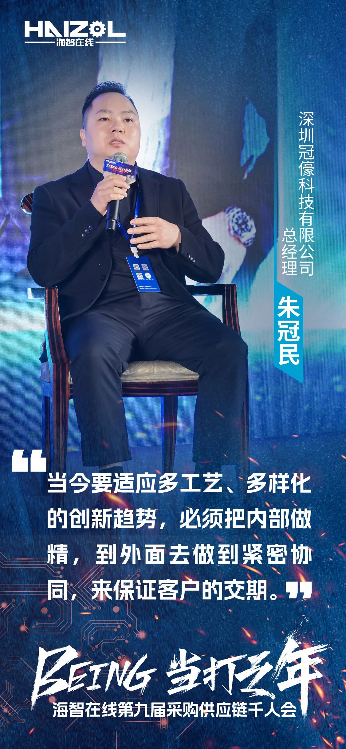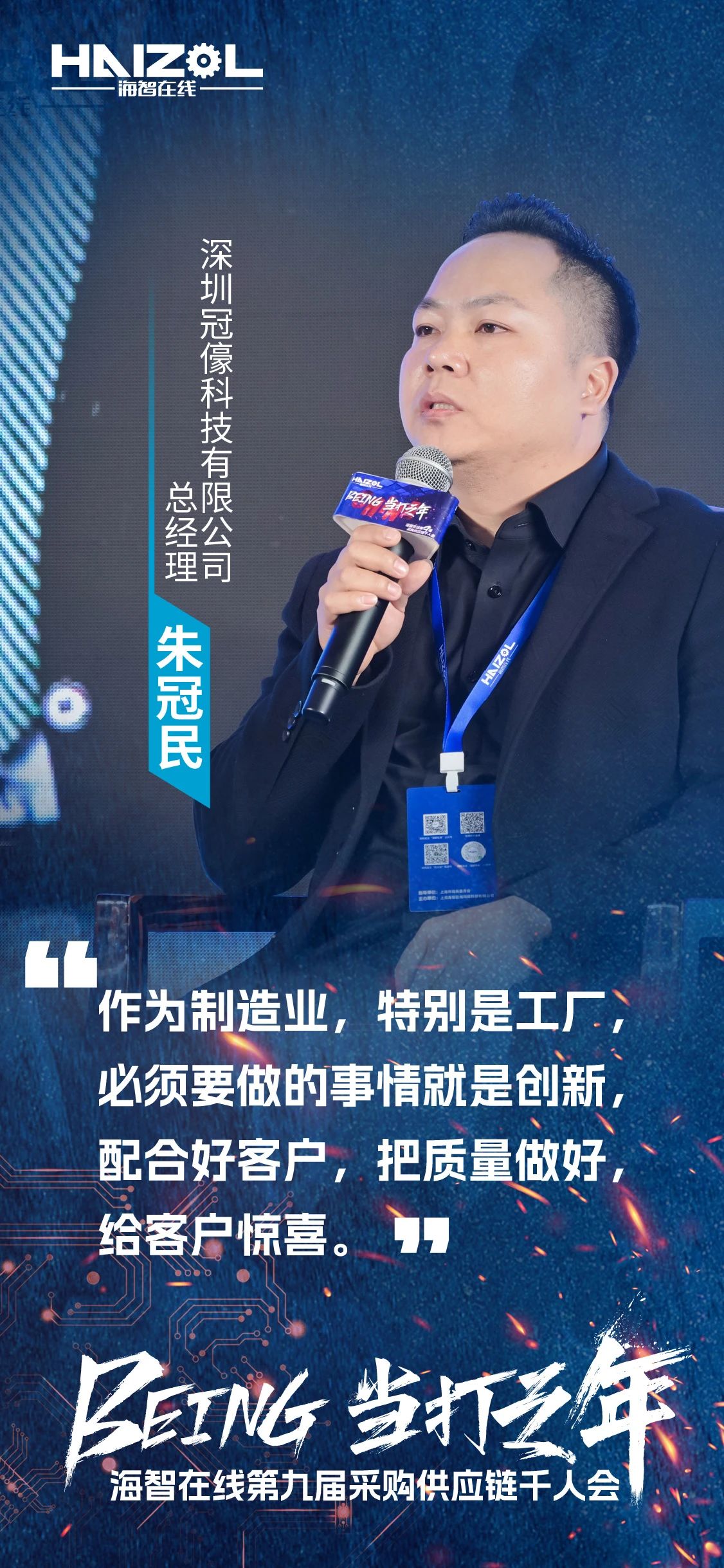 深圳冠儫科技有限公司总经理朱冠民提到:作为制造业,特别是工厂,必须要做的事情就是创新,要配合好客户,把质量做好,给客户惊喜。过去,我曾因受限于传统思维和行业模式,而遭遇过订单断崖式下滑的挫折。如今,我已深刻认识到紧跟时代趋势的重要性,将积极适应小批量、多品种的订单模式,把内部做精,然后紧密协同外部,共同服务全球创新趋势。