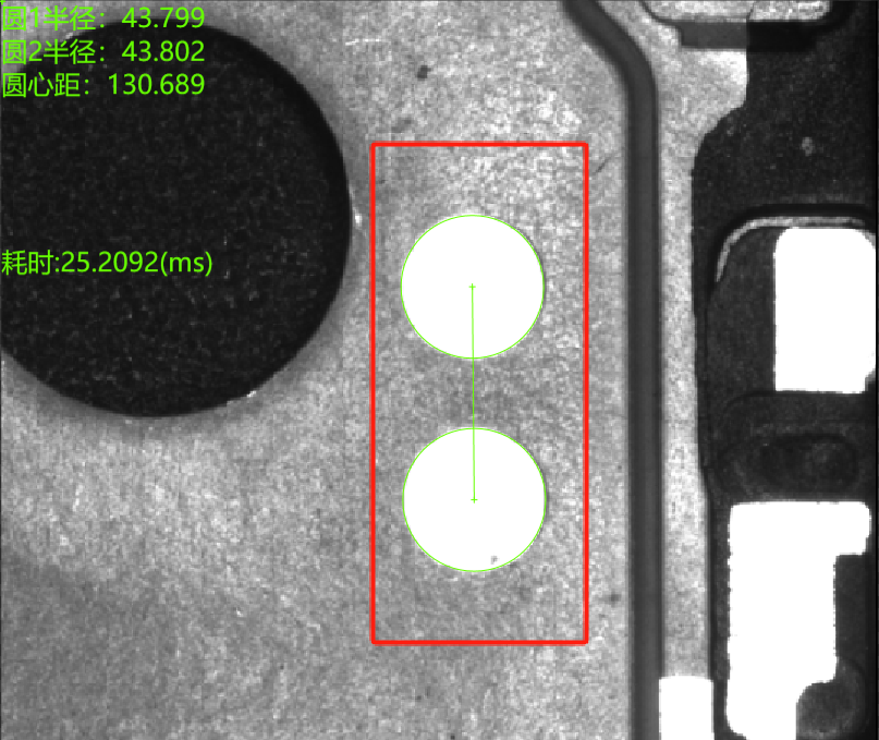想要完成自动化生产,就必须让操作系统能够自动化判定工件与操作设备和机台之间的位置关系。主要检测难点在于精度能否达标。以背板生产为例,需要在磨砂漫射板上定位两个孔。方案选择采用高角度环形光源(型号:CR-15090-B),直接从正面照射到背板表面,两个孔位底部为金属,反光度高,呈现亮色,与背景形成亮度反差。搭配创视专业软件CS-Vison2.0识别检测算法模块,单次检测算法用时25ms以内,检测精度最高可达毫米级。