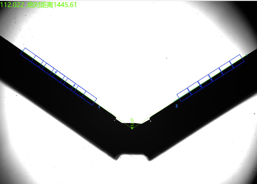 方案选用面阵工业相机+低畸变远心镜头,配合同轴平行光源(型号:CCP-100-B)将产品整体打亮,当光线从屏幕背部直接照射到镜头时,光路平行,两个夹角的边过度像素格较少,软件识别速度更快,检测精度更高。结合创视算法软件,精准定位角度数据,从而达到高精度检测要求。