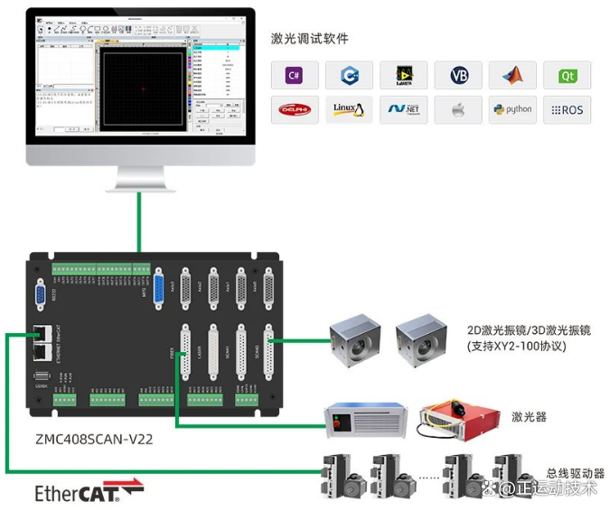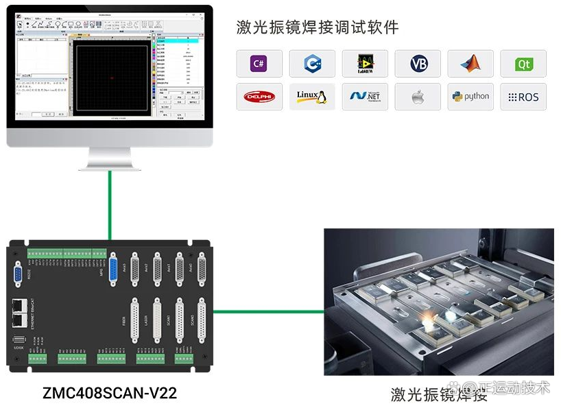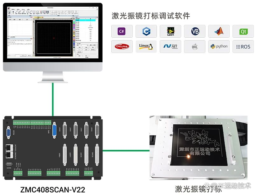 基于ZMC408SCAN-V22开放式激光振镜控制解决方案主要应用于高速标刻、激光清洗、精密切割、精密焊接等非接触式激光加工过程中,通过高速振动的镜片来改变激光的方向,实现高速高精的激光加工。广泛应用于高速高精的激光控制+振镜控制+运动控制的激光加工场合。